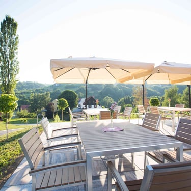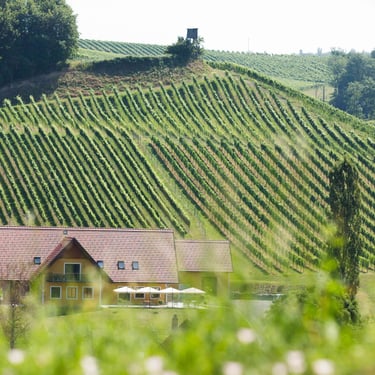 Unser Betrieb ist umgeben von Weingärten und Wiesen. Entspannen Sie auf unserer Liegewiese mit Hängematten oder auf unseren Sonnenstühlen. Oder entdecken Sie die Südsteirische Weinstraße zu Fuß oder mit dem Rad über einen der vielen Wander- bzw. Radwege, die direkt an unserem Weingut vorbeilaufen.